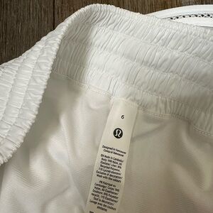 Brand new, never worn lululemon hotty hot high rise 4 inch short. Built in lining and a cute lace trim! Size 6!