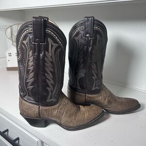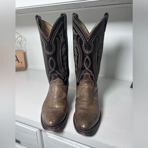 Authentic vintage Justin lizard skin cowboy boots in a classic two-tone Western design. These boots feature genuine exotic lizard leather vamp paired with rich brown leather shafts and traditional Western stitching.