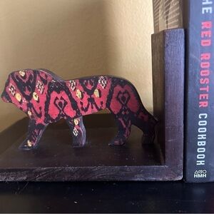 Excellent pre owned condition carved wooden lion bookends painted in a colorful ikat pattern.