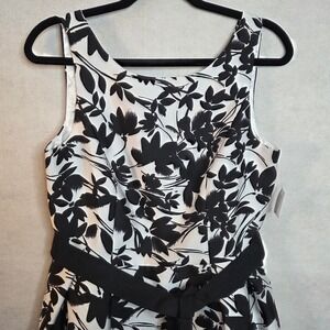 Elegant black and white floral dress by LUXE by Carmen Marc Valvo featuring a flattering fit-and-flare silhouette with a defined waist and attached sash tie. Fully lined with a structured bodice—perfect for work events, cocktail parties, or special occasions.