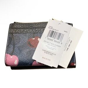 Stylish Coach wallet set. Includes black wallet and blue cardholder. Pink accents add charm. Ideal for everyday use.