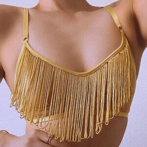 Gold mesh bra with gold fringe. Size L. No underwire. Ultra adjustible straps.