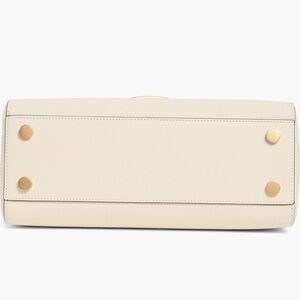 Polished hardware and lightly textured leather distinguish a sophisticated bag fitted with a smooth bamboo top handle and optional strap for hands-free carry.