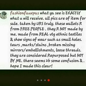 Made from vtg recycled garment remnants missing mirrors/embellishments, loose threads stitching embroidery stains Marks all part of the imperfectly perfect aesthetic. Small wallet pls see pic w/dims..for credit/debit cards/ids/& some $whatever currency ur travels take u.each is different so pls be sure to look at all pics carefully