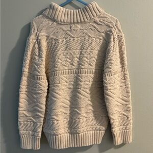 Cozy cable knit sweater. Features buttoned collar. Perfect for layering.