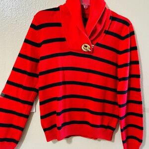 Vibrant red with black stripes. Soft cowl neck. Stylish button accent.