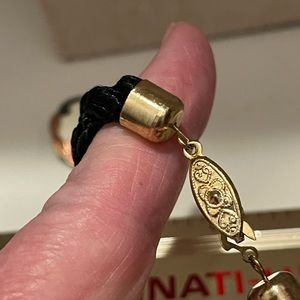 Displayed on a silky twisted black cord with gold caps and locking rhinestone adorned closure