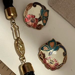 N120 New Cloisonné SET Pendant on Twisted Cord Gold Caps Pierced Earrings