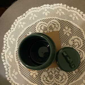 New Rae Dunn Lucky Dog Canister with Lid Color is Green with Gold writing.