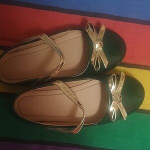 These elegant kids shoes feature a glossy green finish with charming gold accents. Perfect for any occasion, they offer both style and comfort.