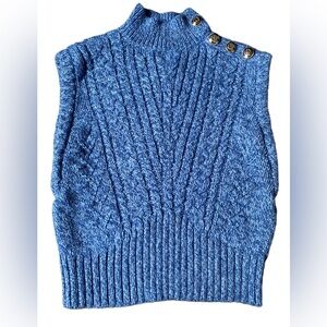 Elegant blue cable knit design. Sleeveless with button accents. Ideal for layering.
