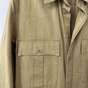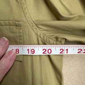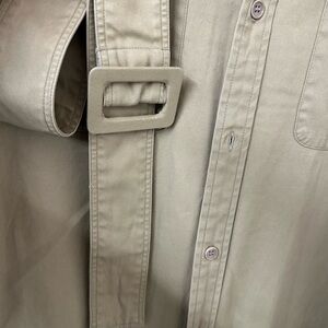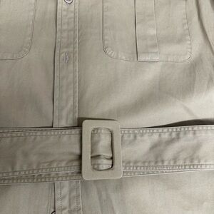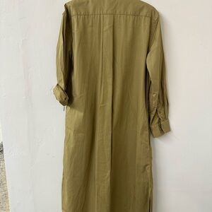 Stylish olive dress with long sleeves. Features button-down front and chest pockets. Perfect for versatile wear.