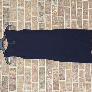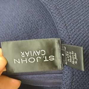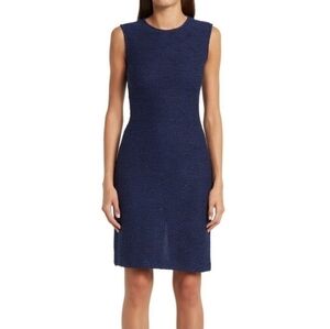 This sophisticated St. John dress in a rich blue hue features a sleeveless design with a classic crew neck. Its sheath style and midi length make it ideal for professional settings, offering a refined and polished look.