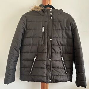 Adorable BearPaw set with a pink knit hat and cozy striped gloves. Perfect for warmth and style.