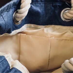 Made from durable nylon material, this rectangular shaped bag features a vibrant blue exterior color with a beige lining. The bag has an open closure and double ivory handles, making it easy to carry.