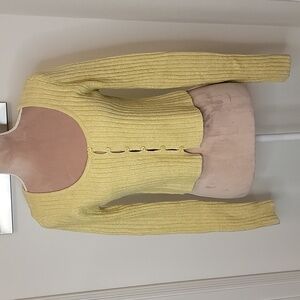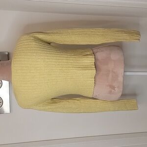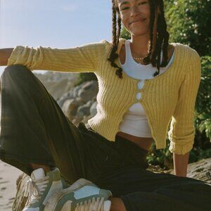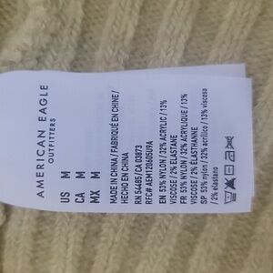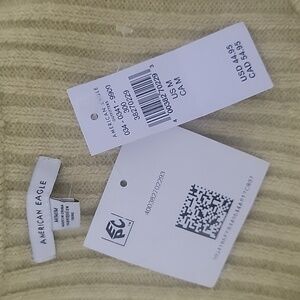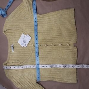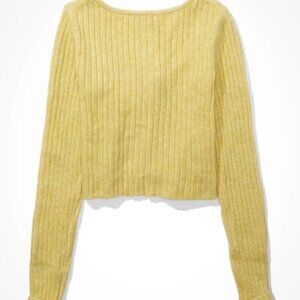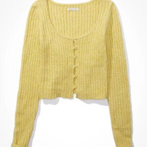 American Eagle, Cropped Button Down Sweater, Long Sleeve, Size M, NWT. AE calls the color 'green', but it looks like a dusty yellow. "AE Button-Front Cardigan. A super soft cardigan with a flattering close-to-you fit and a button-up front. Soft ribbed fabric adds texture to your look, Long sleeves, Scoop neck, Button front. 32% Acrylic, 53% Nylon, 13% Viscose, 2% Elastane. Machine wash. Imported" Please refer to measurements in photo to ensure proper fit.
