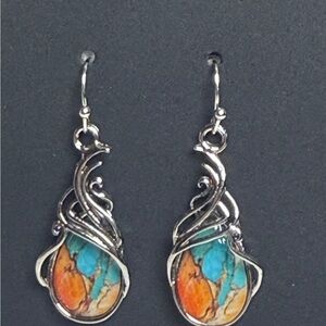 These artistic silver earrings feature stunning turquoise and orange accents, perfect for adding a vibrant touch to your ensemble.