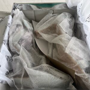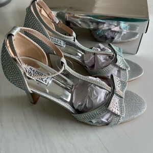 Elegant silver heels with shimmering details. Features a stylish strappy design and secure buckle closure.