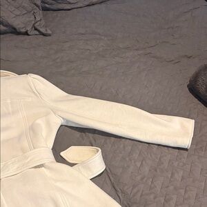 Stylish cream trench coat by Express. Features a belted waist and button details. Ideal for a sophisticated look.