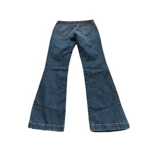 GAP 90's Vintage Long and Lean bootcut jeans in a medium tint wash. These jeans are designed for a flattering silhouette and feature a comfortable stretch fabric. These are in excellent pre-loved condition with no flaws other then the smallest fraying on one leg about 2 inches wide (see rear view picture).