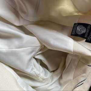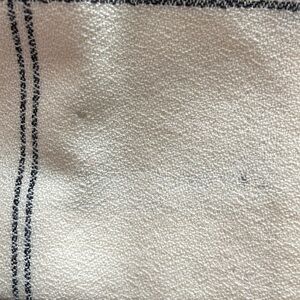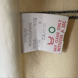 This vintage cream blazer with black stripes is 100% wool. It is fully lined, tag does not specify the material but it feels like acetate. It has shoulder pads and pockets in the front. It still has its tags on, so that price is in 1980s dollars! Despite it being new, it has been stored in a closet for a while so there is some minor damage such as a couple of holes just above the hem on the back of the jacket as well as some on the lapels. Photos and video provided. The holes are small, the biggest one on the back is about the same size as the tip of my push pencil.