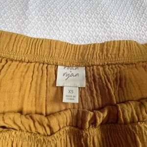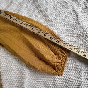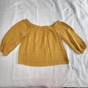 The Roan + Ryan Mira Off Shoulder Blouse in women's size XS is a stylish and versatile top with a flattering off-the-shoulder neckline and pleated detailing. Made of comfortable cotton material with a woven fabric type, this gold blouse features 3/4 sleeves and a pullover closure for easy wear. Perfect for casual occasions, the classic fit and cropped style add a touch of bohemian or peasant-inspired flair to any outfit. Easy to care for with machine washable instructions, this blouse is a must-have for your wardrobe, suitable for all seasons.