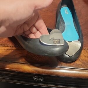 Stylish black flats with a silver heart accent. Comfortable and chic design.