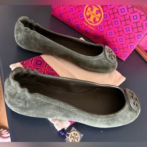 Chic suede flats by Tory Burch. Elegant green hue. Perfect for versatile wear.