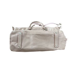 This pre-owned Coach satchel features a lavender/pink leather exterior with silver-tone hardware and a detachable pink shoulder strap. The front displays the "Coach" logo and a pleated detail. The interior is lined with a purple fabric. Visible signs of wear include some discoloration and scuffs on the exterior leather, particularly near the base and handle attachments, and a small yellow mark on the front. The bag has dual top handles and a zippered main compartment. A ruler in one image indicates a width of approximately 16 inches.