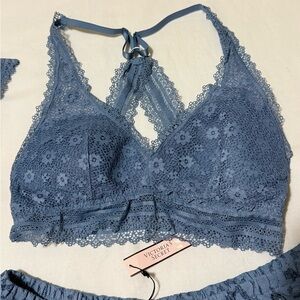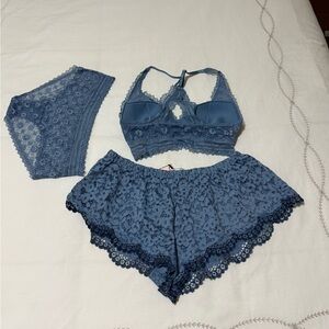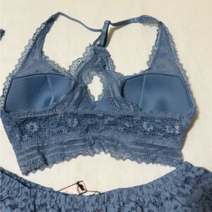 Elegant lace bralette and shorts set in a beautiful blue shade. Perfect for comfort and style. Top is XS and bottom is small. Both tags removed. Pants are small NWT