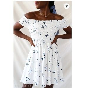 Lulu's White and Blue Printed Off-the-Shoulder Dress Polka Dot Sundress XS