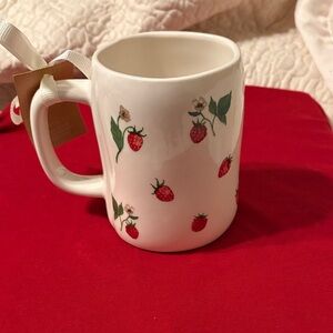 Charming mug with 'Love Is Sweet' in red. Adorned with strawberry illustrations. Perfect for cozy sips.