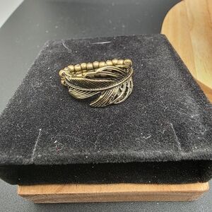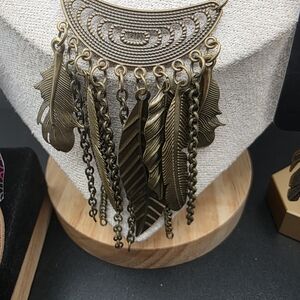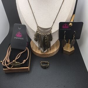 Chic bronze necklace with feather accents. Includes matching earrings, bracelet, and ring. Perfect for any occasion.