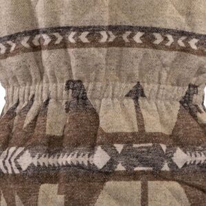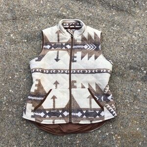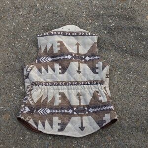 Stylish vest with a geometric pattern. Features shades of brown and cream. Perfect for layering.