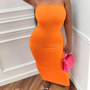 Make a statement in this jaw-dropping orange strapless maxi dress! Perfect for any occasion where you want to exude confidence, elegance, and effortless style. This dress features a sleek, curve-hugging fit that enhances your natural shape, while the strapless neckline adds a touch of sophistication.