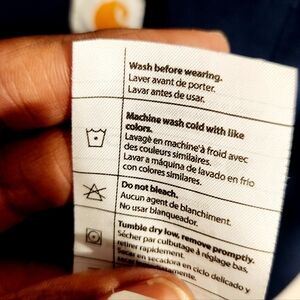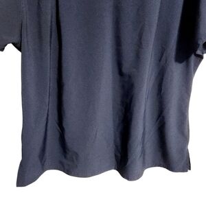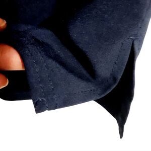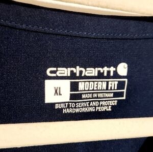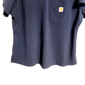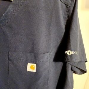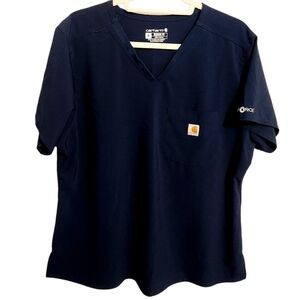Women's navy blue, v-neck, one pocket scrubs top or shirt by Carhartt, size XL. Modern fit. Small side splits. Force logo on sleeves. Fabric blend of polyester and spandex. Excellent pre-owned condition; no flaws.