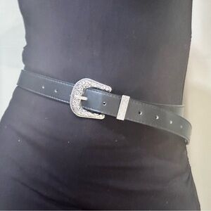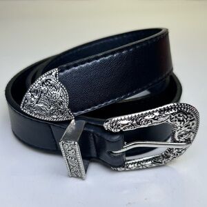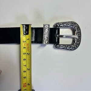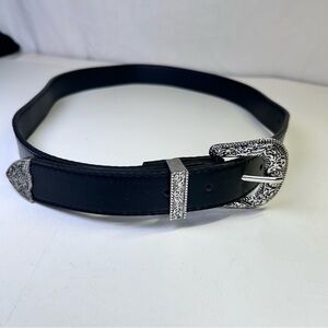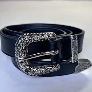 NWOT Black PU Leather Western Belt, Silver Tone Buckle stamped floral design M/L
