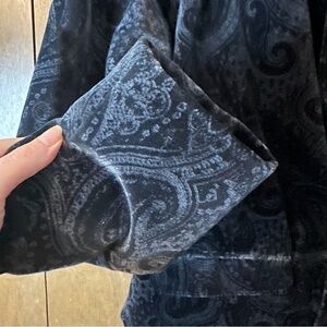 This blazer jacket is vintage perfection! Featuring black velvet paisley boho pattern and open front pockets. Does have shoulder pads sewn under the jacket lining.