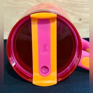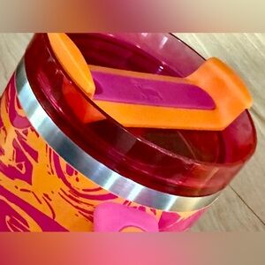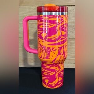 AUTHENTIC orange and pink Stanley 40oz quencher. Has a neat textured feel to the finish. Purchased new at Dicks Sporting Goods. In good used condition. Inside is not stained. Has some dings near bottom of cup (see photos). Lid is scratched and has some dings (also see photos). Never had any alcoholic beverages in it. Has been cleaned and sanitized.