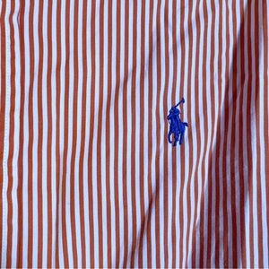 Classic Ralph Lauren button-down shirt from the 120’s 2-July line, featuring a red and white striped pattern and signature embroidered pony logo at the chest.