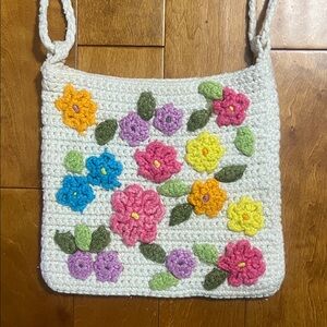 Charming crochet shoulder bag featuring vibrant floral designs. Perfect for adding a touch of color to any outfit.