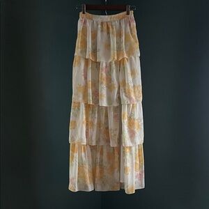Chic floral maxi skirt with layered design. Soft cream base with pastel floral accents. Perfect for versatile styling.