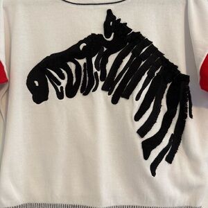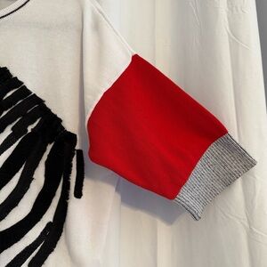 This Gabby Isabella cotton sweater features a bold zebra appliqué design with textured fringe on the front. It includes colorblock 3/4 sleeves in red with grey ribbed cuffs and hem, a round neckline, and a relaxed fit. The lightweight cotton knit and statement details make it a great early-spring piece for adding texture and interest to casual outfits.