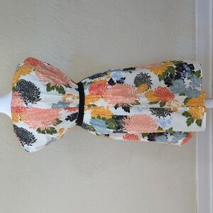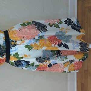 This midi dress from the Zara Basic Collection features a vibrant floral pattern on a white background, cap sleeves, high crew neckline, side pockets, and a contrasting black belt around the elastic waist. Lightweight. Unlined. Color White/Orange. Size XS.
