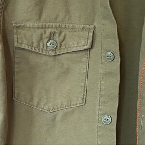 Dark olive green collared military style shirt-jacket with button-up design. Features subtle red stitching accents, would be perfect over a tee or tank. Size medium.