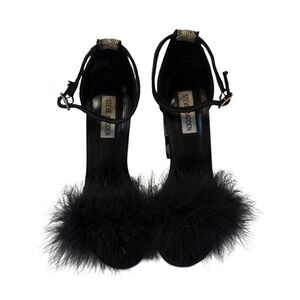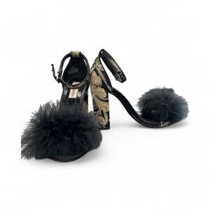 The product is a stylish Steve Madden Carabu Black Chunky Heel featuring a unique gold floral embroidered design on the heel and strap area. The front of the shoe is adorned with feathers. This women's size 7.5 heel is perfect for various occasions including travel, weddings, parties, casual outings, formal events, and workwear. The ultra-high block heel (4.5 inches) and open toe make it a fashion-forward choice for the modern woman looking to make a statement with her footwear. There is the ankle buckle closure. The bottoms are scuff free and clean. see photos