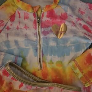 Colorful tie-dye rashguard set. Long sleeves with zipper. Includes matching bottoms. Heart detail on chest.