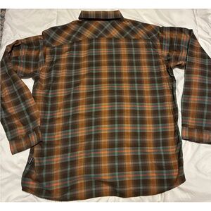 Patagonia men’s long sleeve button front flannel-style shirt in a brown, teal, orange, and gray plaid pattern. Size Men’s XL.