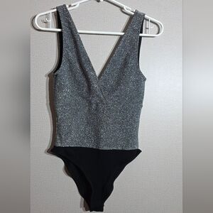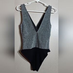 Chic bodysuit with a sparkling silver top and sleek black bottom. Ideal for stylish outings.
