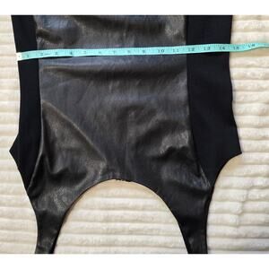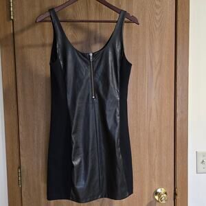 Free People faux leather bodycon mini dress with stretch ponte side panels in the color black, size medium. In great prelove condition. No flaws seen. No holes, no stains.